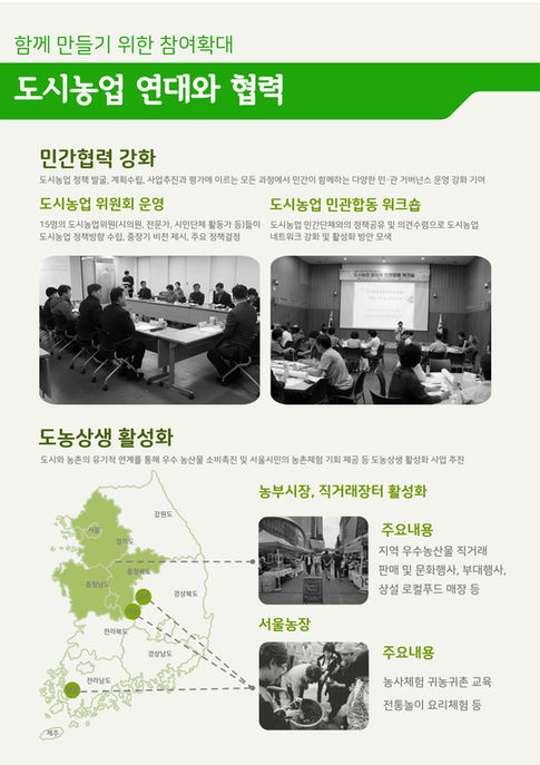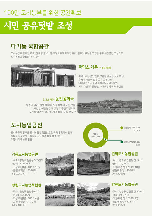 서울시는 2012년 도시농업 원년선포 후 지자체 최초 도시농업박람회, 주말농장, 민관거버넌스 법제화, 먹거리창업센터, 서울농부포털 등 도시농업을 선도해 왔습니다.시민, 전문가과 함께 고민하여 계획한 도시농업 5개년의 이번 도시농업 3.0플랜에서는 공간확보, 참여확대, 가치증진이라는 3대 추진전략을 내세워 건강하고 행복한 서울을 100만 도시농부와 함께 만들어가려 합니다.